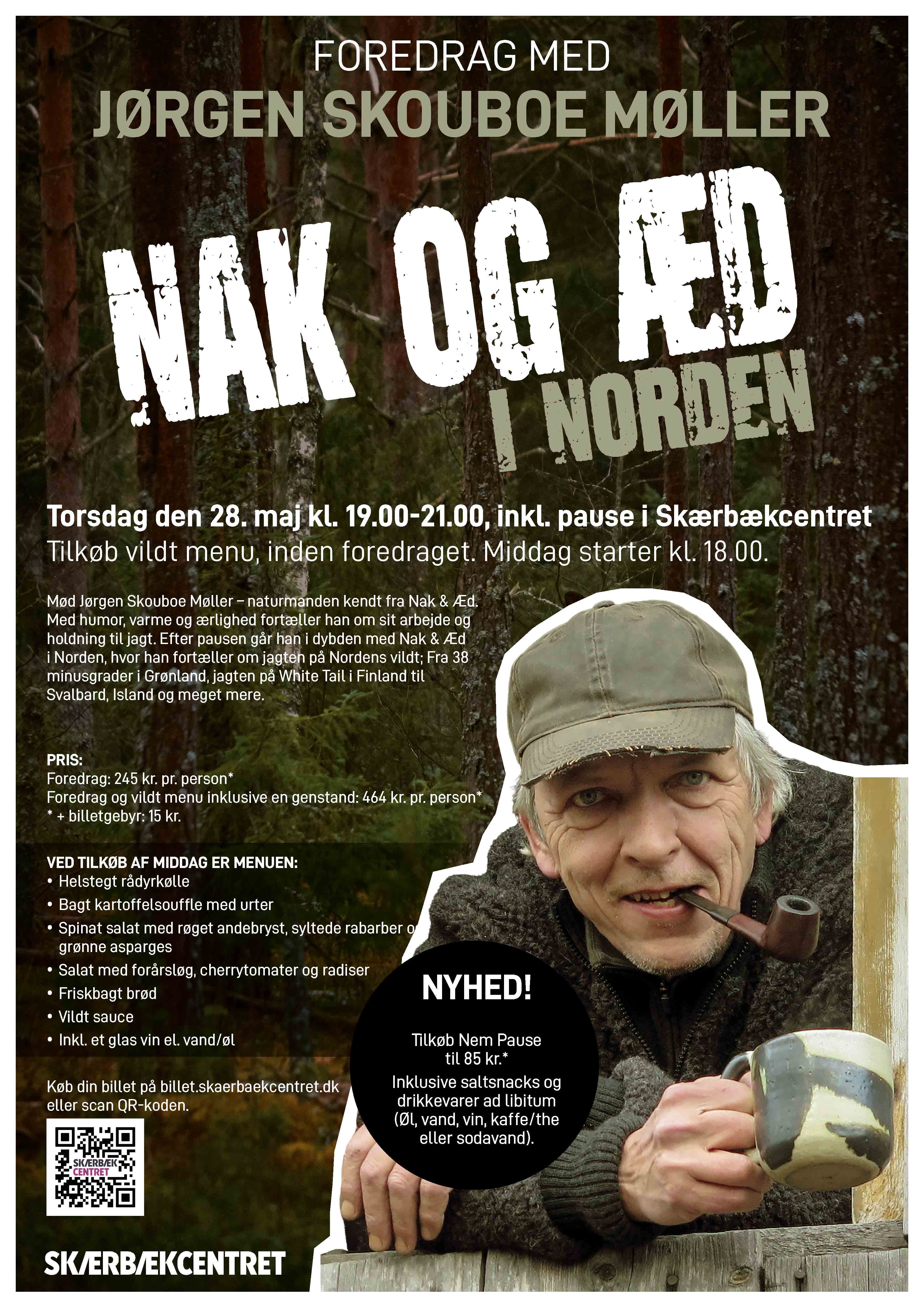 Oplev Jørgen Skouboe Møller, kendt fra Nak & Æd, DR-Derude og Frilandshaven. Med lune, humor og ærlighed fortæller han om livet på jagt, arbejdet bag tv-programmerne og glæden ved det enkle friluftsliv. Foredraget handler om naturen som fristed, håndværkets værdi og fællesskabet omkring mad og oplevelser.