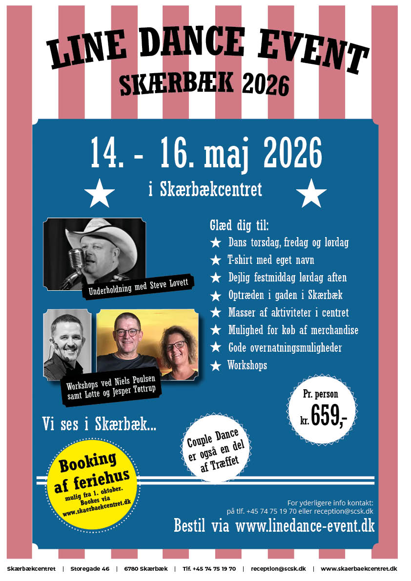 Sæt allerede nu et stort kryds i kalenderen den 14.-16. maj 2026, for her går det løs igen med det store Line Dance Event i Skærbækcentret - og i 2026 fejrer vi træffets 25 års jubilæum!