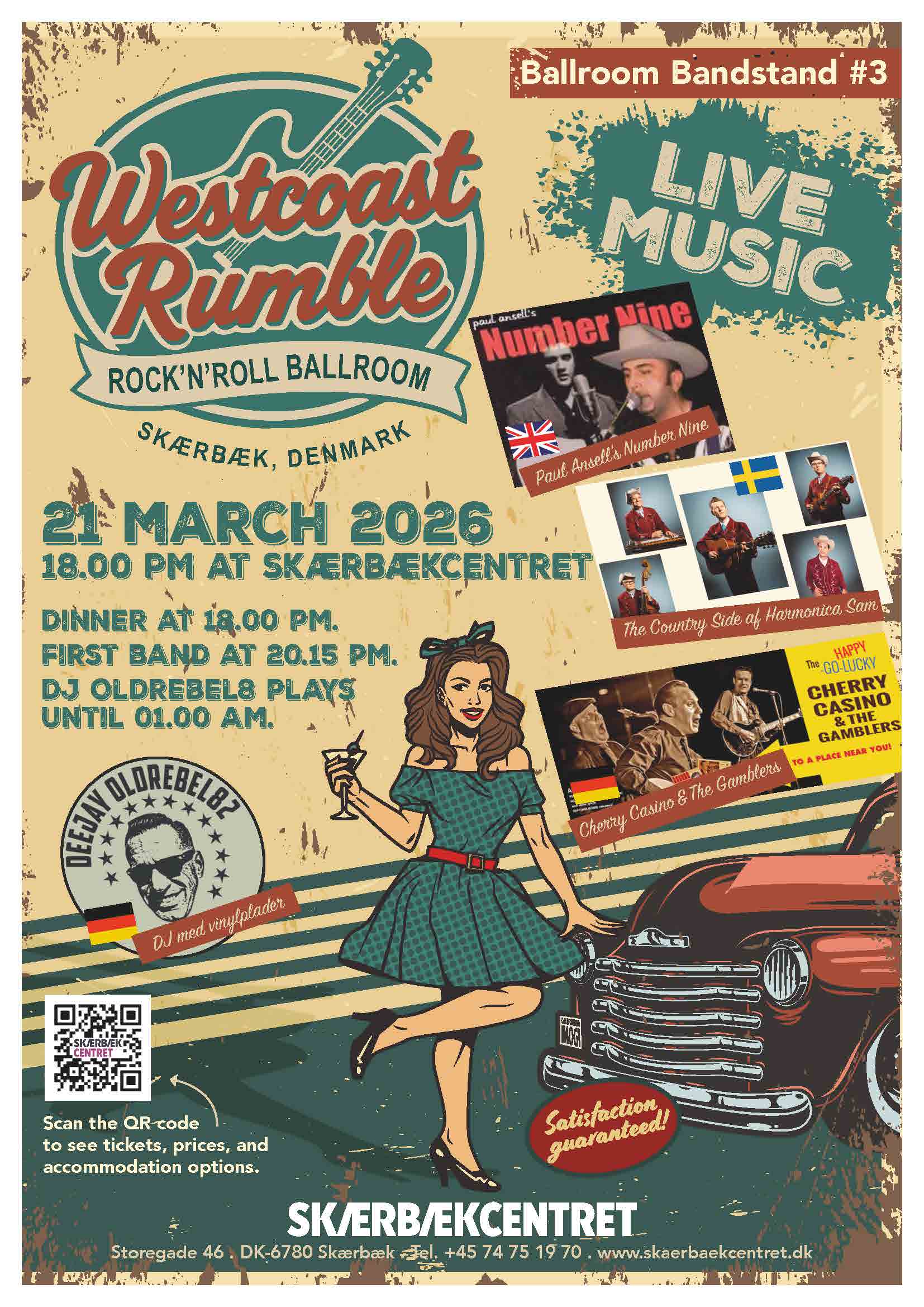 Westcoast Rumble is ready to take over Skærbækcentret, turning up both the tempo and the atmosphere. We’ve brought together three bands who live and breathe rockabilly and country – the kind of music that quickly gets your shoulders moving and your feet dancing.